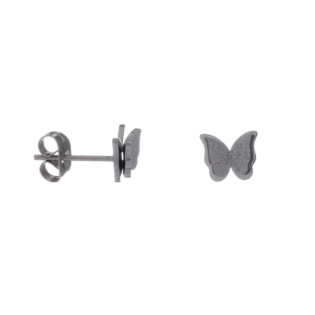 Siro kimaltava perhonen on tarpeeksi pieni korvakoru arkiseen käyttöön. Alempi siipi on kiillotettua terästä ja ylempi siipi kimaltavaa pintaa teräksessä.