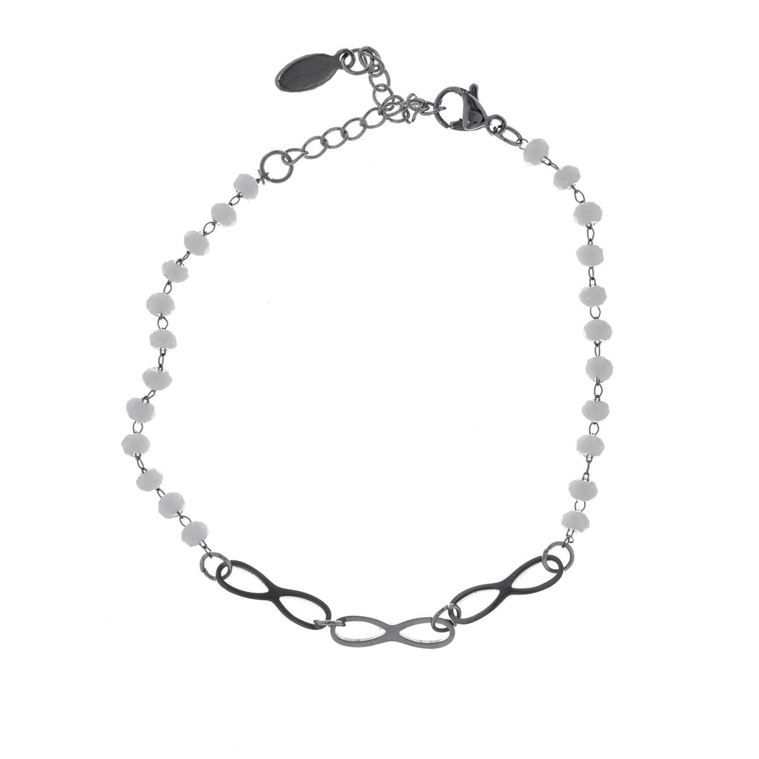 Ohueeseen teräsketjuun on punottu pieniä viisteisiä lasihelmiä. Keskellä ranneketta punos vaihtoo äärettömyys symboleihin.