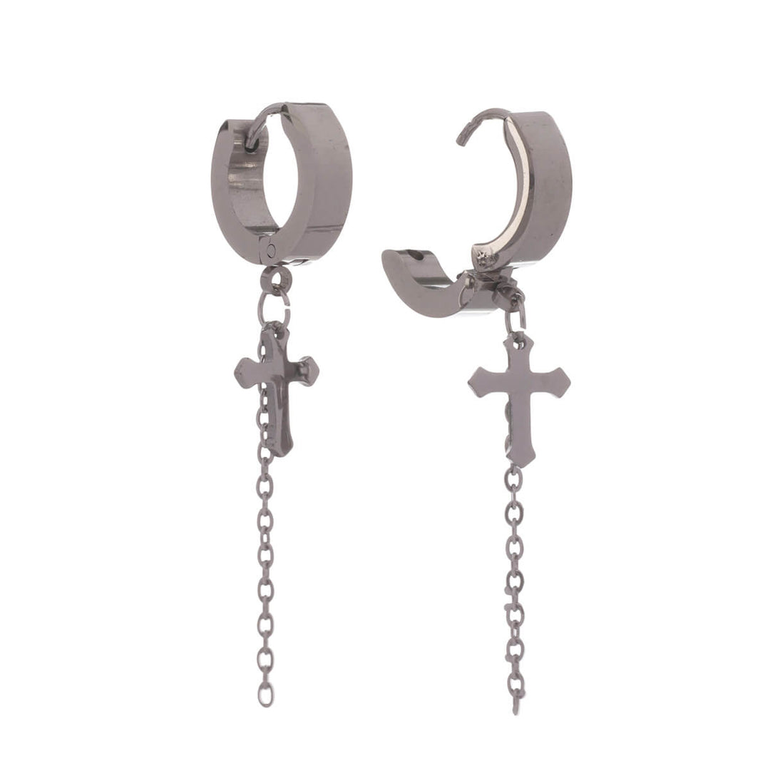 Tyylikäs teräksinen rengaskorvakoru roikkuvan ristin ja ketjun kanssa.