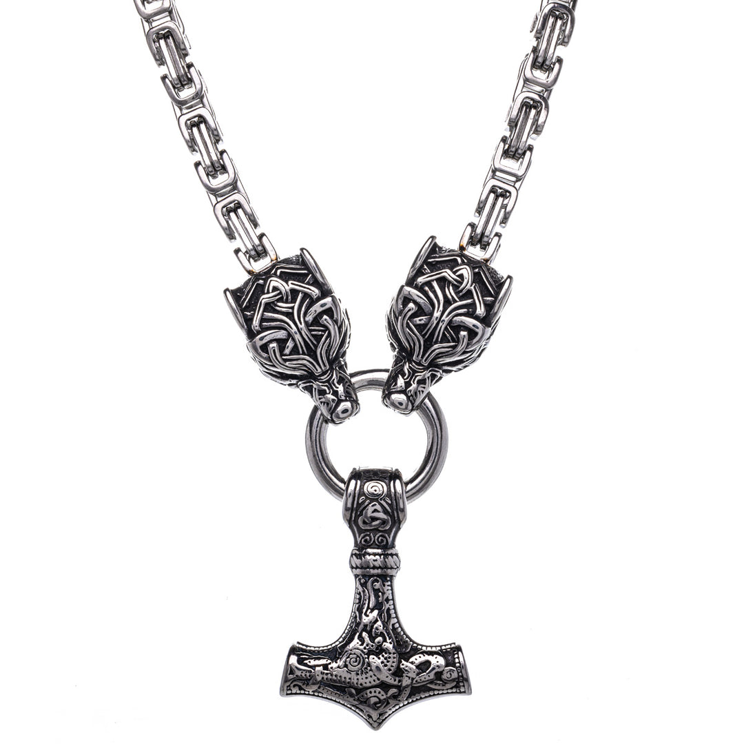 Voimakas ja myyttinen, tämä koru on suunniteltu vaikuttamaan. Thorin vasara, Mjölnir, riippuu keskeisellä sijalla, yksityiskohtaisesti muotoiltuna ja täynnä viikinkiajan kaiverruksia. Ketjun päädyt on koristeltu Fenrir-susilla, jotka ovat norjalaisessa mytologiassa tunnetun jättiläismäisen suden kuvauksia. Nämä päät toimivat ketjun lukkoina, yhdistäen voiman ja viisauden ikoniset symbolit. Tämä koru on täydellinen valinta niille, jotka haluavat kantaa mukanaan viikinkien perintöä ja näyttää samalla arvostuksensa pohjoismaista designia ja tarustoa kohtaan.