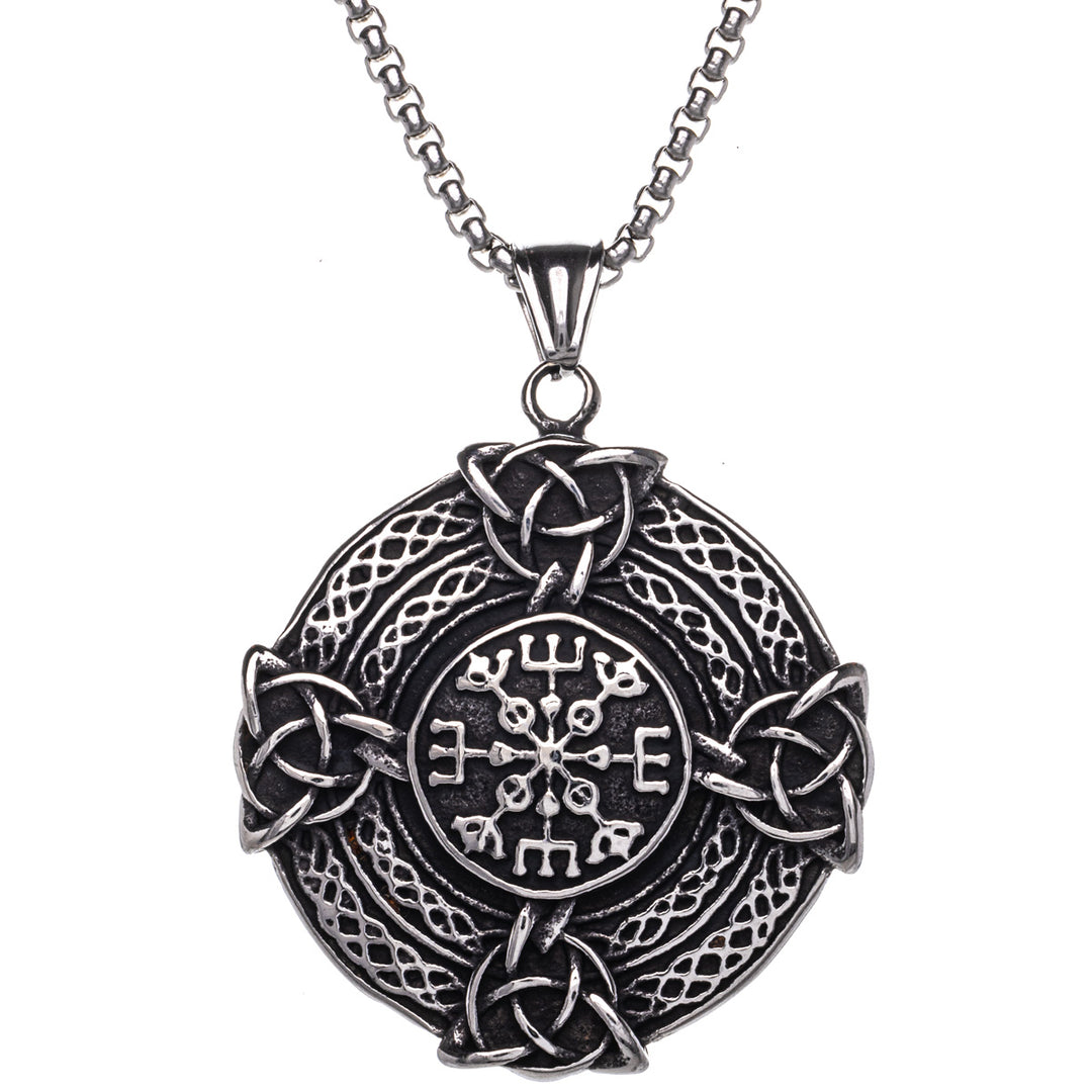 Voimakas teräsriipus sisältää Vegvisir-symbolin, jota vanhat tarinat kutsuvat viikinkien kompassiksi, kietoutuneena kiehtoviin kelttiläisiin solmuihin. Tämä riipus on suunniteltu niille, jotka etsivät ohjausta ja suojelua henkisellä matkallaan. Vegvisirin sanotaan ohjaavan kantajansa läpi elämän haasteiden, ja kelttiläiset solmut symboloivat elämän monimutkaisuutta ja kietoutuneita polkuja. Tämän riipuksen tumma viimeistely ja historiallinen muotoilu luovat ainutlaatuisen asusteen, joka on sekä puhutteleva että henkisesti merkityksellinen.