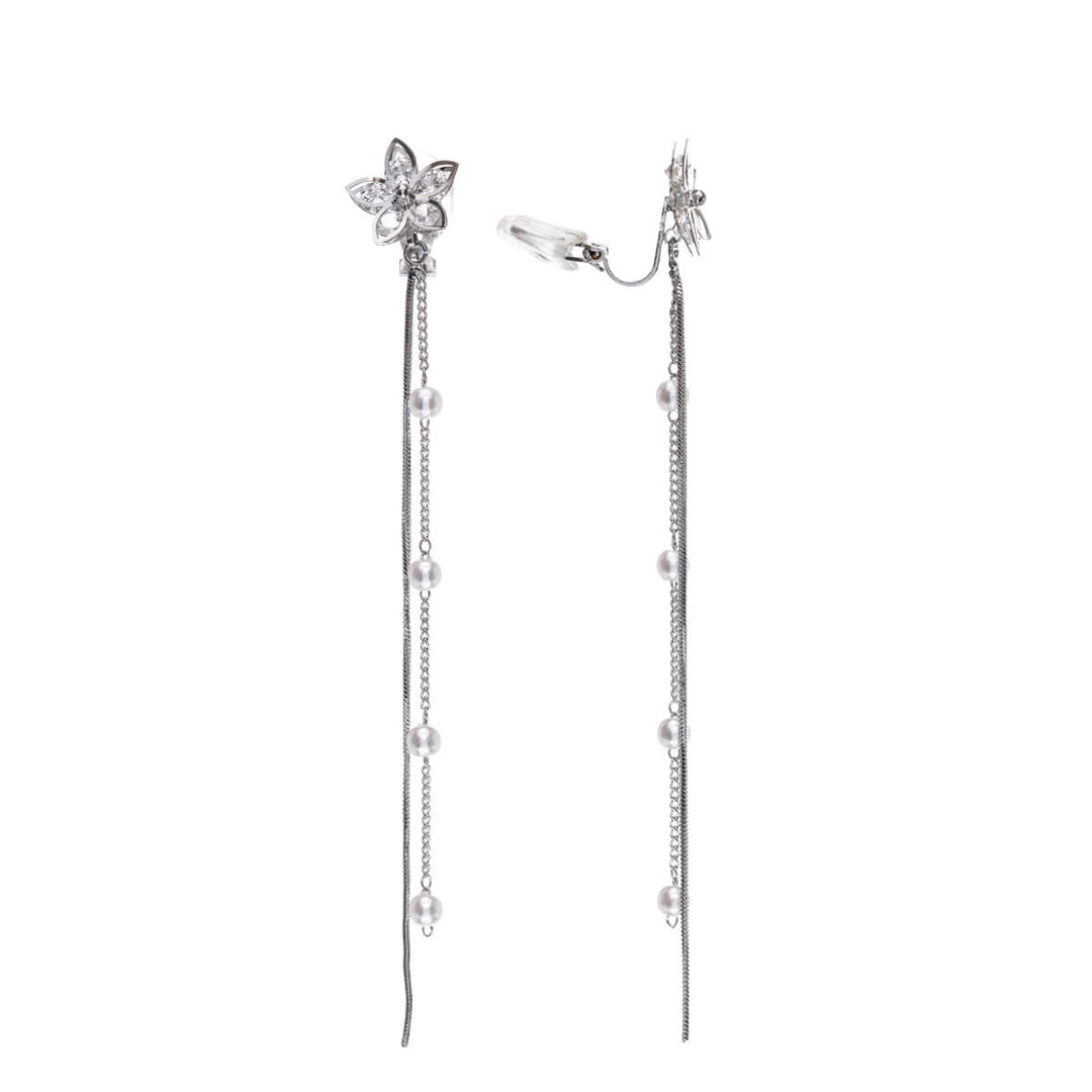 Kirkkaat zirkonia kivet muodostavat kukan, mistä roikkuu kaksi ketjua. Kimaltelevaan korvakoruun helmet tuovat kauniin yksityiskohdan.