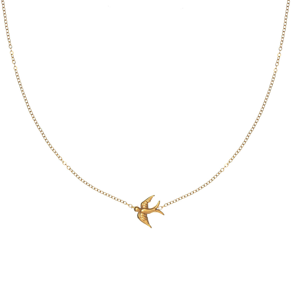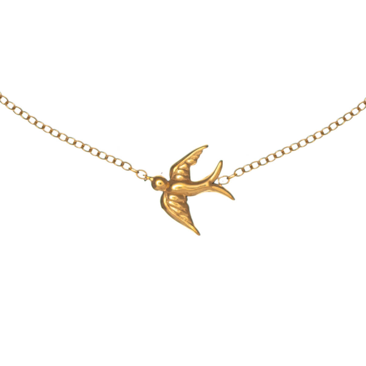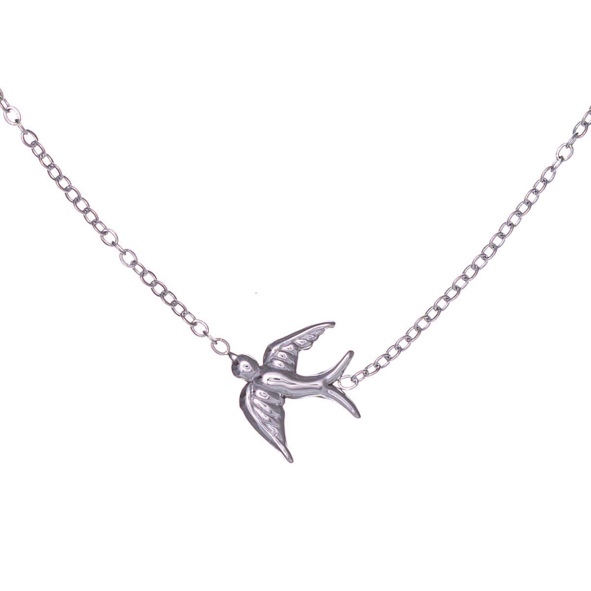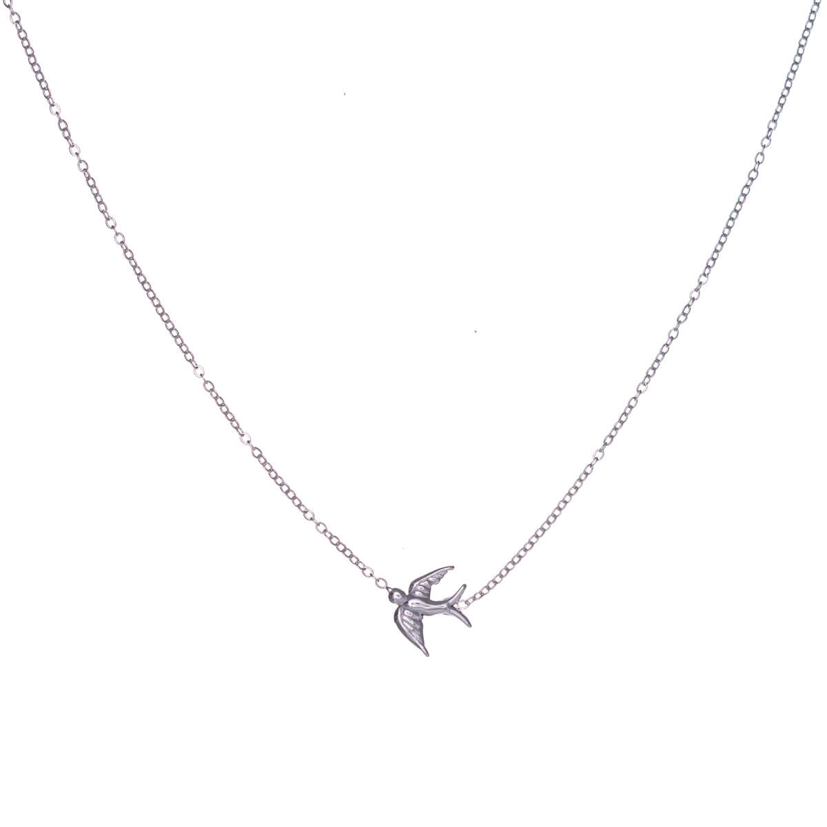 Detta tunna halsband är lätt att bära och diskret. Halsbandet är dekorerat med en liten svala i mitten. Halsbandet är helt tillverkat av kirurgiskt stål. Stålet slits inte med användning.
