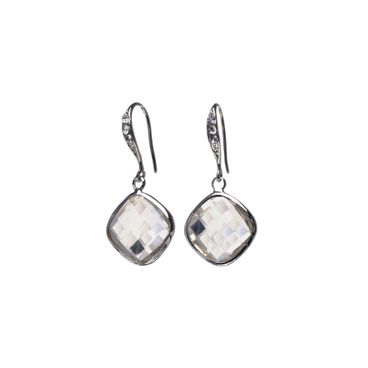 Ett hjärta och pärlor som hänger från en klar glassten är de vackra örhängena på ett chip.