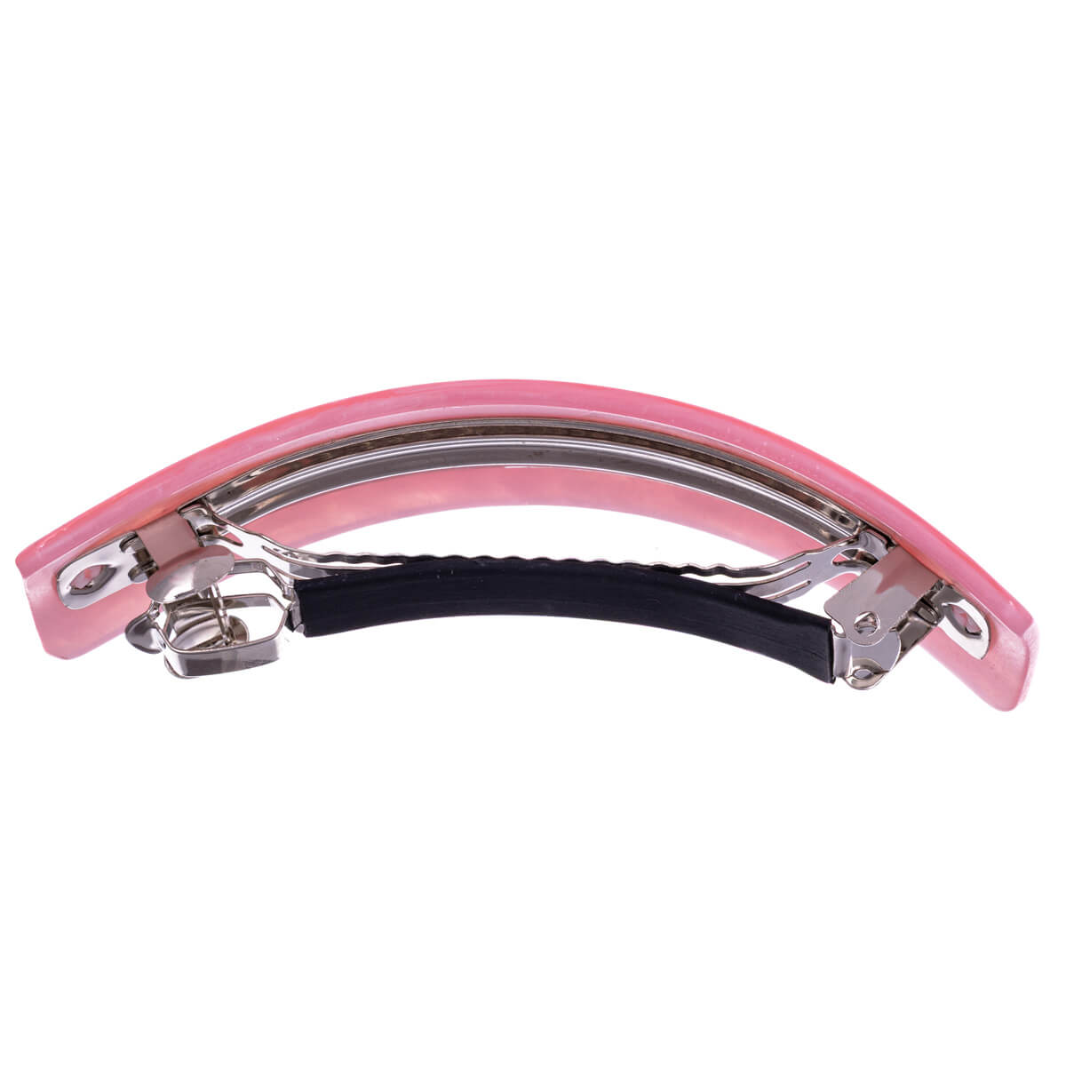Denna hårklämma i metall gör det enkelt att hålla håret på plats. Metallklämman är försedd med en vacker, böjd plastdekoration. I denna modell har metallklämman en svart plastbeläggning på spännet för att förhindra att den glider i håret. Den hårvänliga hårklämman har ett tre-stegs spänne, så att du kan justera hur hårt du vill fästa den.