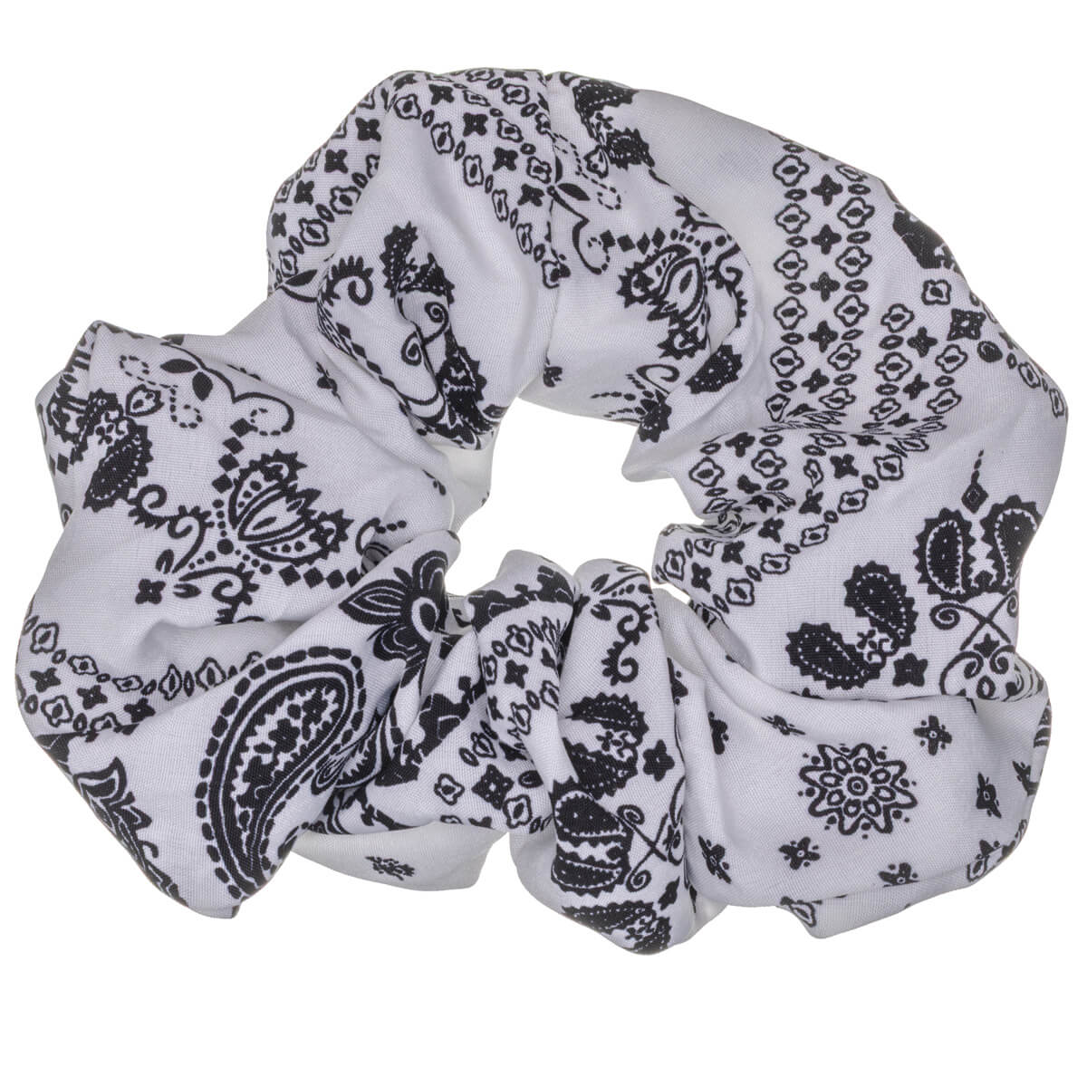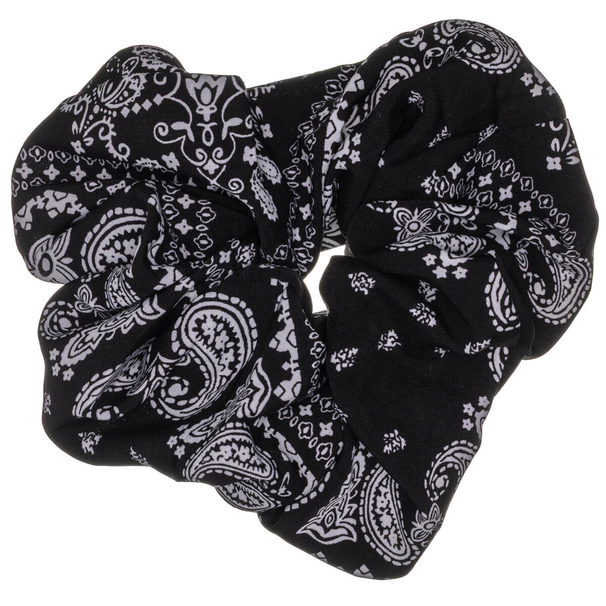 Denna scrunchie med paisleymönster ger den klassiska bandanastilen en modern twist. Den större storleken på 14 cm och det rikare tyget gör denna scrunchie iögonfallande och luftig – det perfekta valet när du vill ge håret mer volym och uttryck.