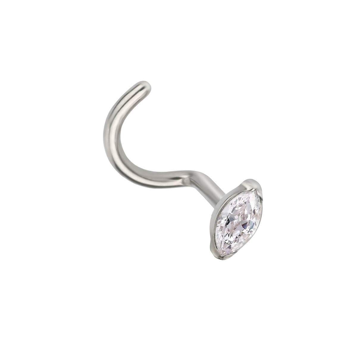 En vacker marquise zirkonia sten gnistrar som en diamant i denna näsring. Den här modellen har inga spännen utan är förböjd i spiralform och glider in i en näspiercing.
