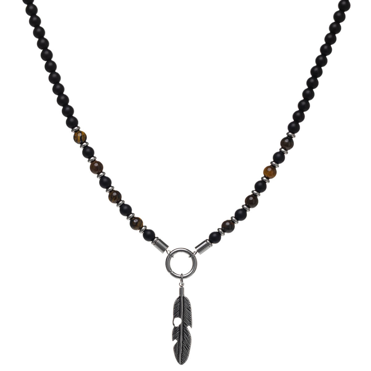 Ett tidlöst elegant halsband för män, som kombinerar mattsvarta glas pärlor, bruna natursten pärlor och ett noggrant bearbetat stålspänne. Halsbandet har ett lugnt, naturligt och medvetet maskulint utseende.