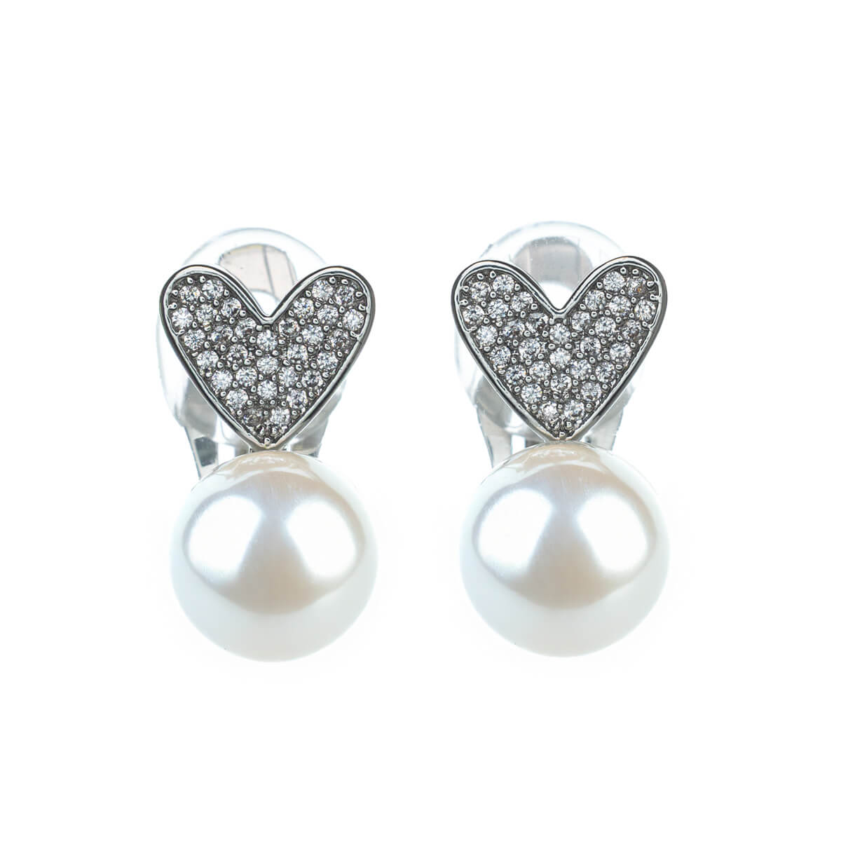 Ett hjärta utsmyckat med zirkoner pryder pärlan på detta clip-on-örhänge. Det utsmyckade pärlörhänget är ett bra alternativ till traditionella pärlörhängen.