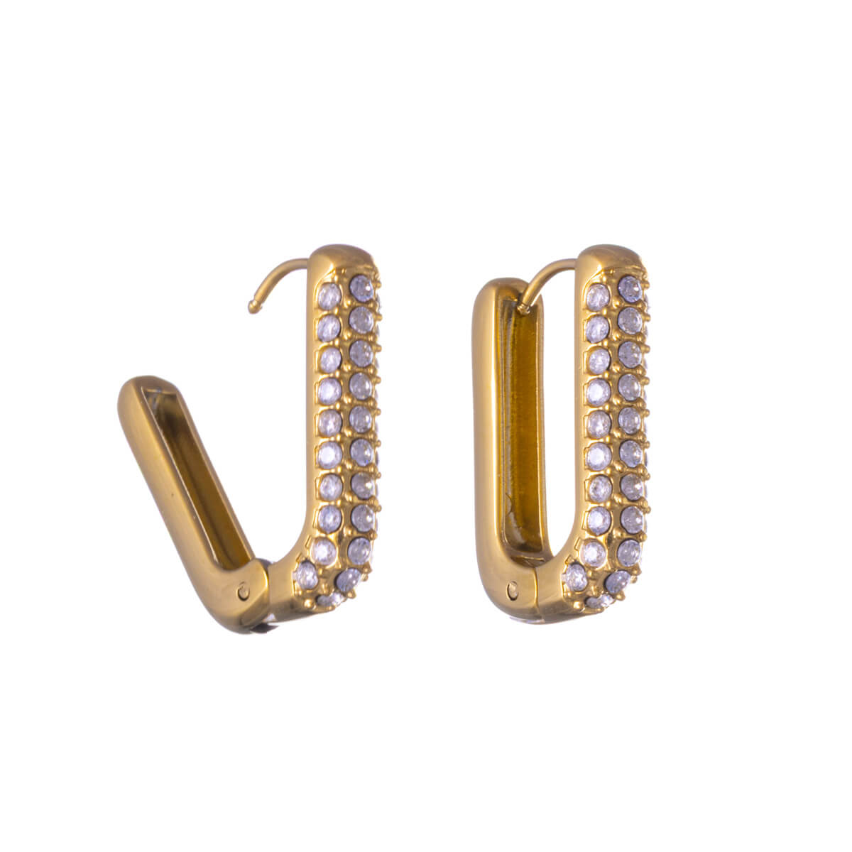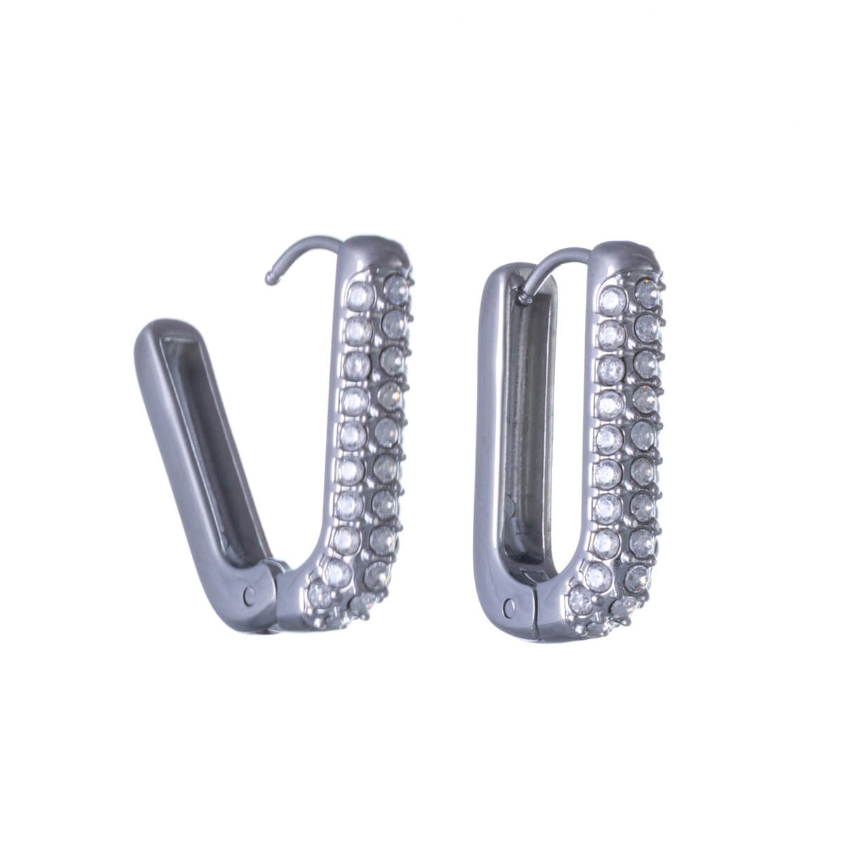 Trendiga rektangulära örhängen som är dekorerade med klara glasstenar på framsidan. Örhängena med gångjärn är lätta att knäppa av och på. Örhängena är helt tillverkade av kirurgiskt stål. Örhängena slits inte vid användning.