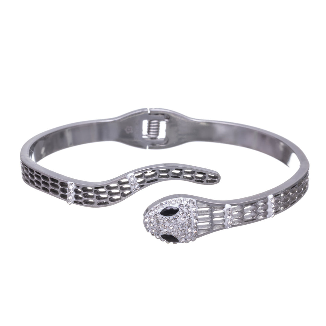 Det heltäckande stålarmbandet är ett slående och unikt armband. Armbandet öppnas med ett fjädergångjärn. Armbandet har ett vackert ormmotiv som är dekorerat med klara glasstenar.