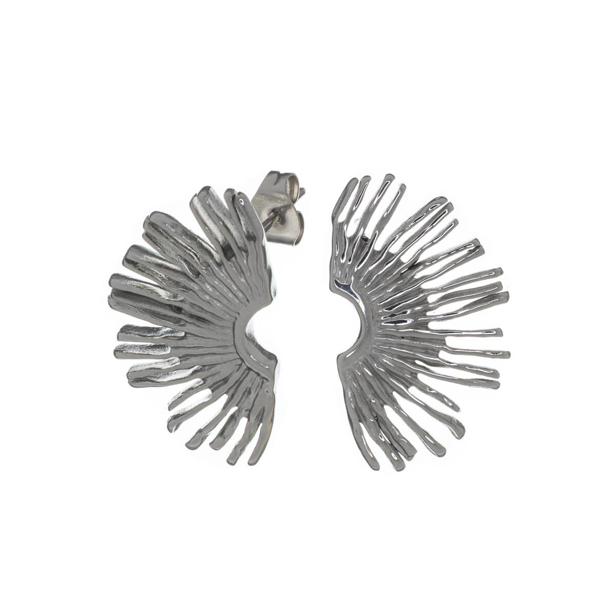 Böjda örhängen i stål är som halva solar. De yttre kanterna på de diamantformade örhängena är ojämna. Vackra solstrålar kommer garanterat att skapa en unik look på det här örhänget i stål. Smycket är helt tillverkat av kirurgiskt stål.
