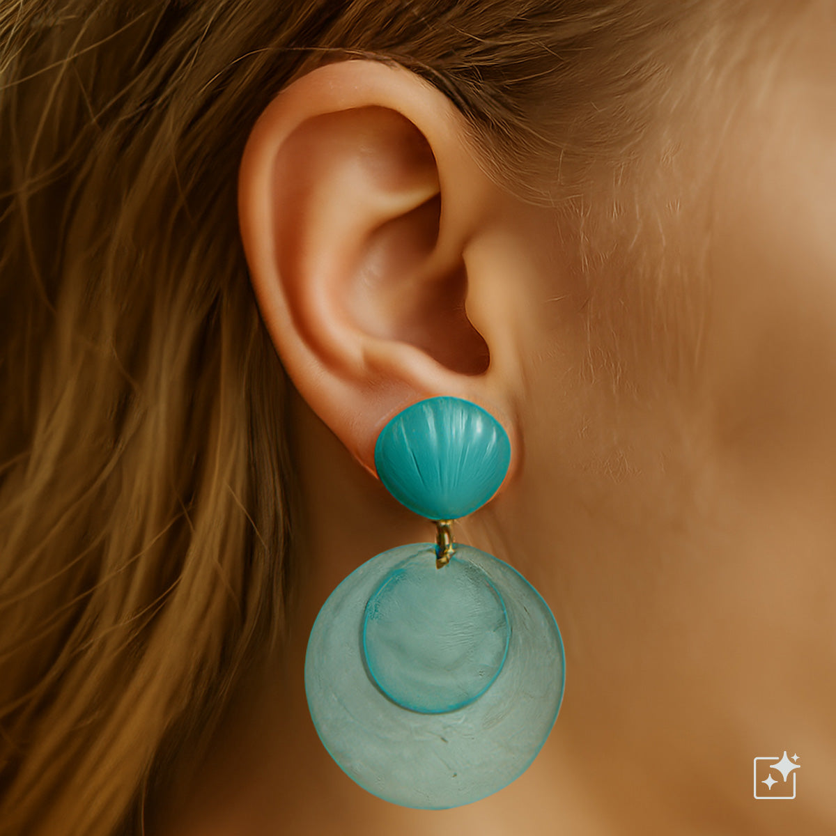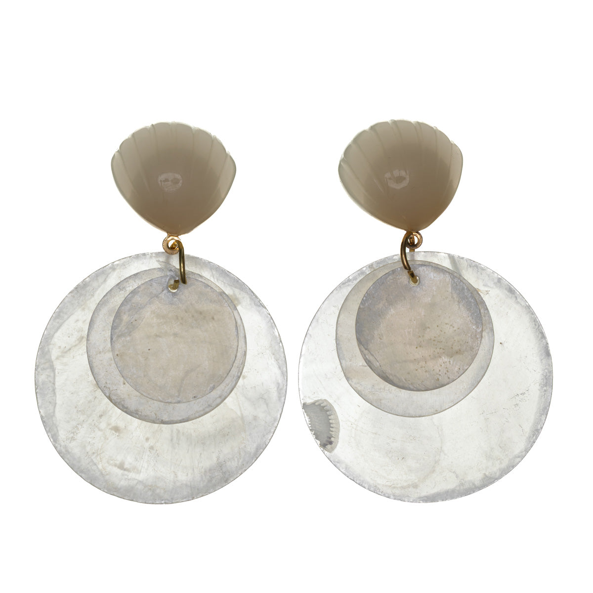 Tre hockeyklubbor i olika storlekar från snäckskal som hänger från ett plastskal. Det vackra sommarörhänget är lätt och pråligt. Det här örhänget väcker minnen av sommar och sandstränder.