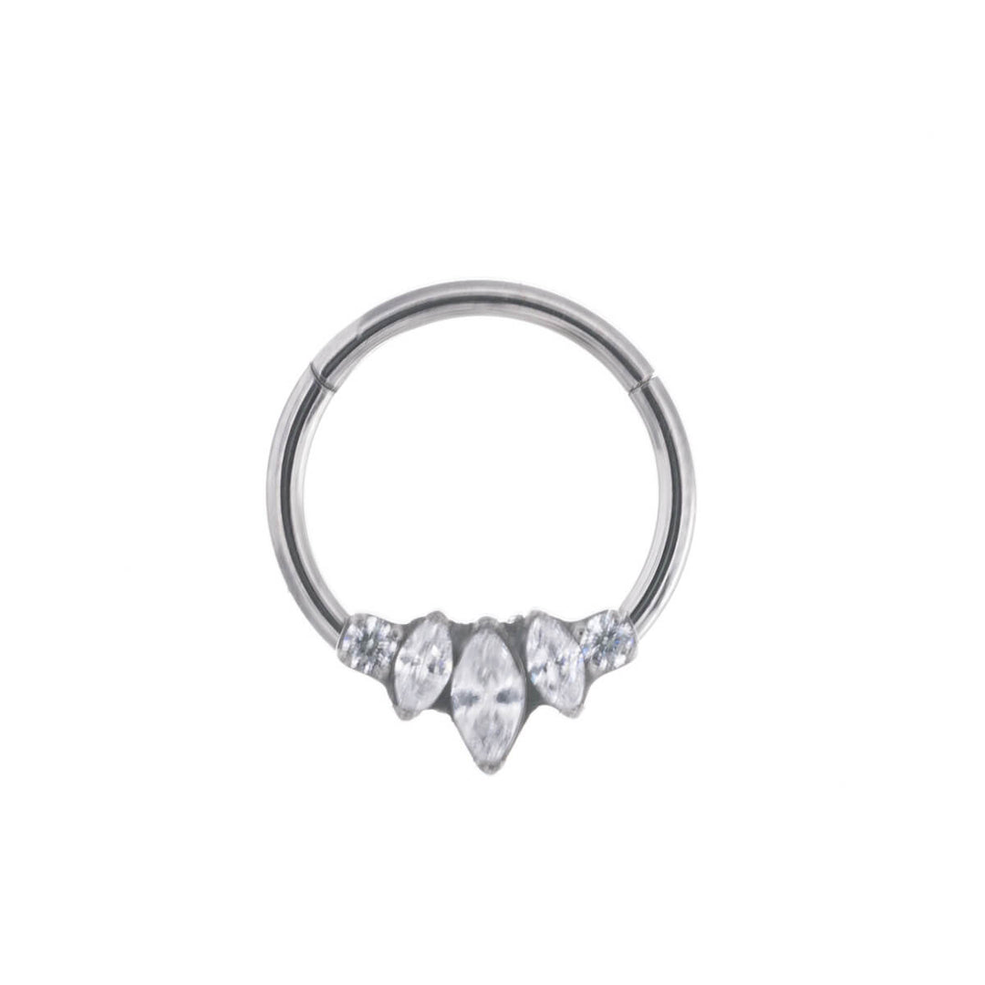 Ljusa zirkoniastenar gnistrar vackert i den här segmentringen. I denna design flankeras de tre marquise-zirkoniastenarna av små runda zirkoniastenar.