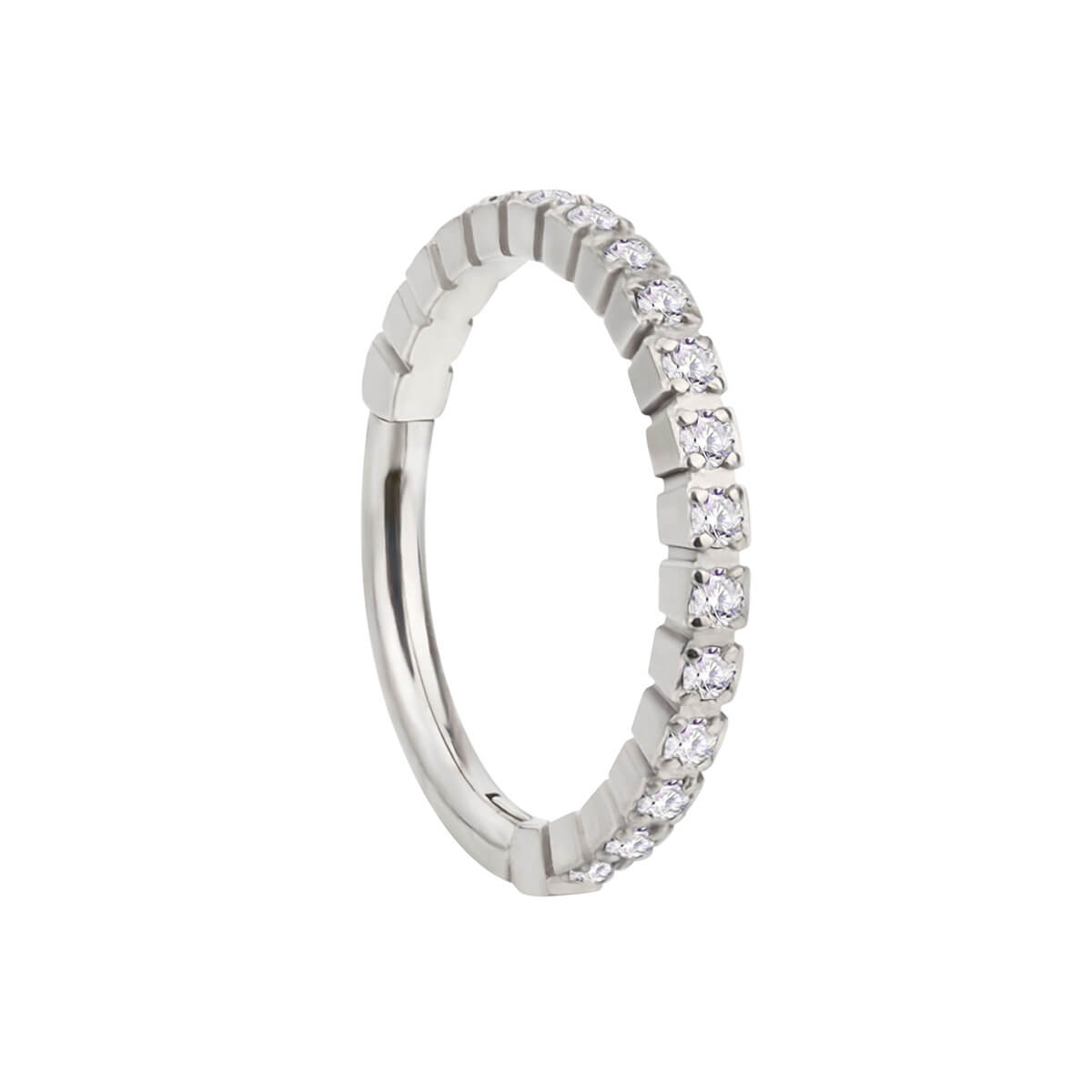 En piercingring med zirkoniastenar i pavéform får dina smycken att glittra. Zirkonia-stenarna är uppradade. Ringens kropp är vackert indelad efter varje sten. Smycket är helt tillverkat av titan.