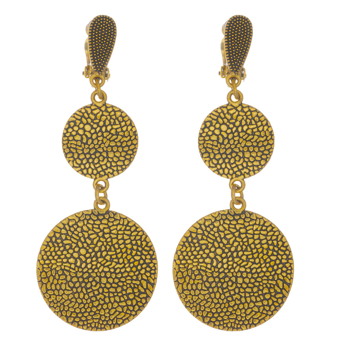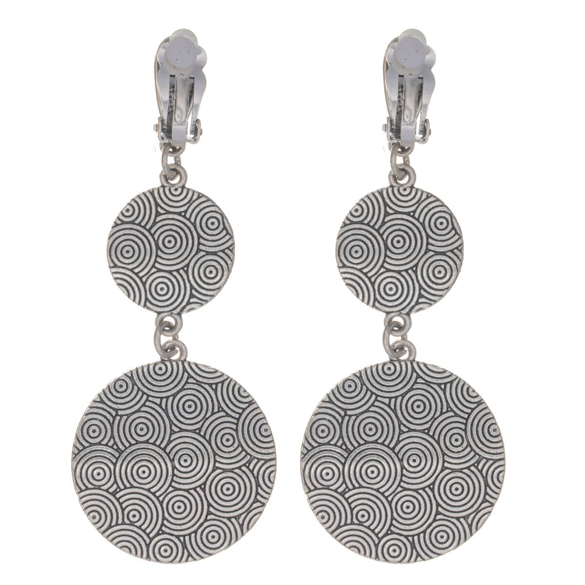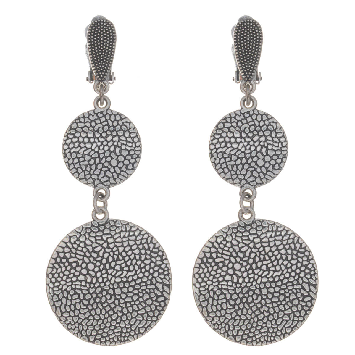 Platta, mönstrade ringar hänger från en spetsig öronbygel. Det iögonfallande långa örhänget har en patinerad, diskret yta. Klämörhänget kräver ingen hål i örsnibben.
