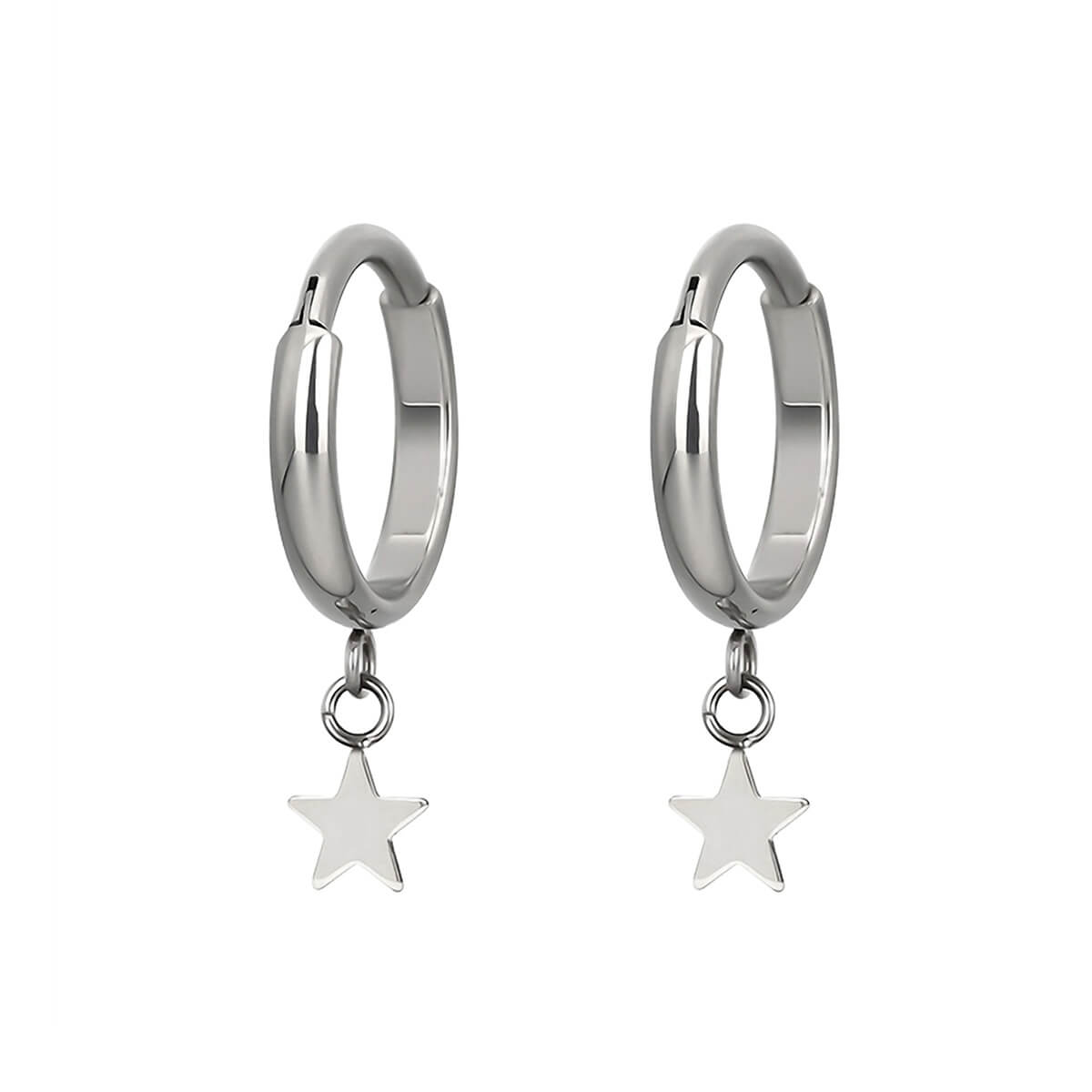 Titan är det bästa valet av material för örhängen. I den här designen hänger en stjärna från ett titanörhänge. Den fina öronringen öppnas och låses med ett snäpp. Smycket är helt tillverkat av titan.
